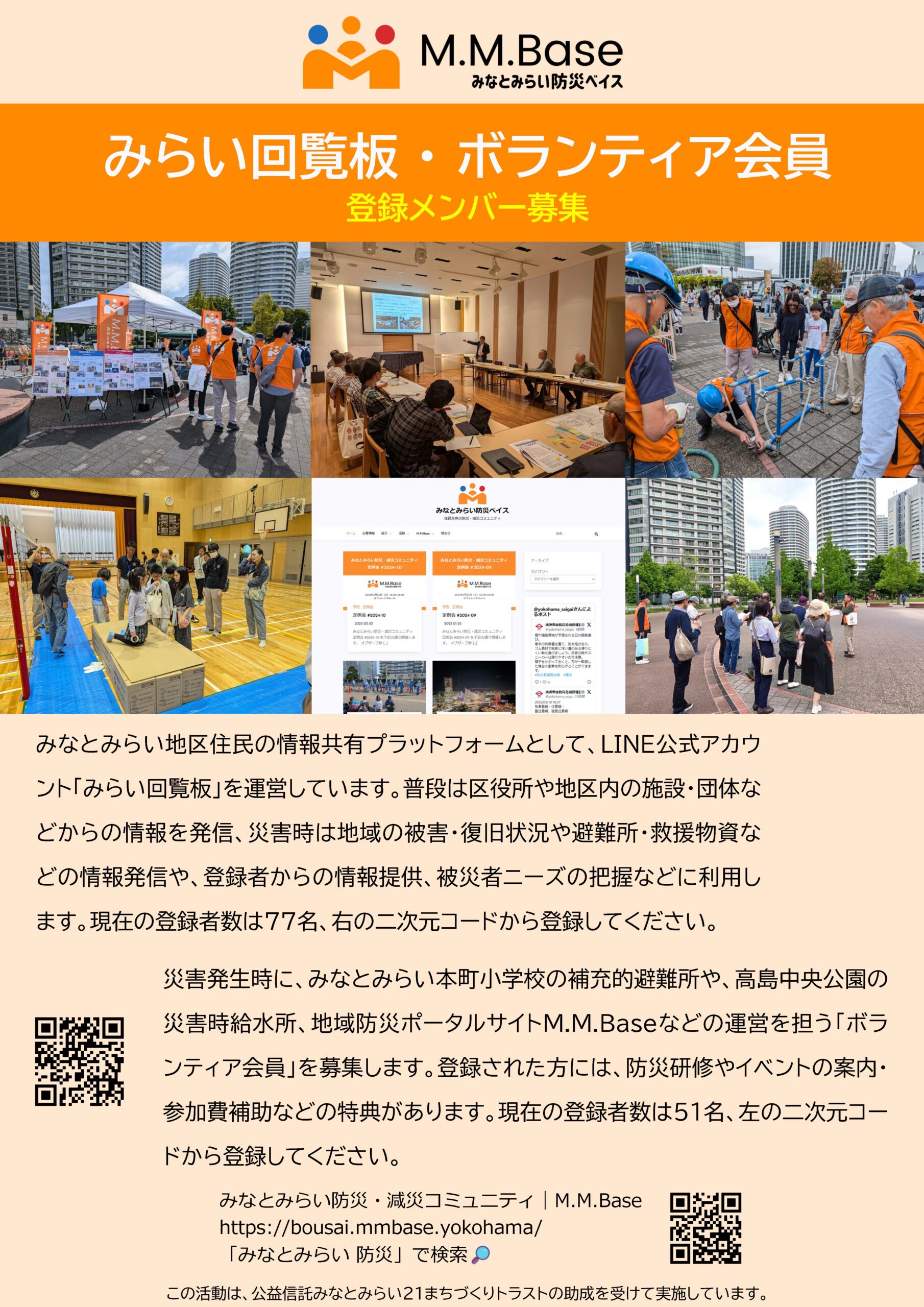 災害発生時に、みなとみらい本町小学校の補充的避難所や、高島中央公園の災害時給水所、地域防災ポータルサイトM.M.Baseなどの運営を担う「ボランティア会員」を募集します。登録された方には、防災研修やイベントの案内・参加費補助などの特典があります。現在の登録者数は51名、左の二次元コードから登録してください。